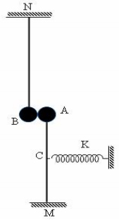 Cho hệ cơ như hình vẽ: Thanh MA có khối lượng không đáng kể, chiều dài l = 50cm, đầu tự do của thanh có gắn vật nhỏ khối lượng m = 100g, đầu M có thể quay dễ dàng. Lò xo nhẹ có độ cứng K = 100N/m, được gắn vào trung điểm C của thanh MA. Khi hệ cân bằng lò xo không bị biến dạng. Kéo quả cầu A ra khỏi vị trí cân bằng để thanh AM lệch khỏi phương thẳng đứng một góc nhỏ rồi thả nhẹ, lấy g=10m/s2.