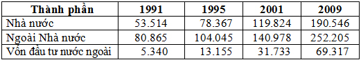 Tổng sản phẩm trong nước (GDP) phân theo thành phần kinh tế nước ta giai đoạn 1991-2009 (Đơn vị: tỉ đồng)