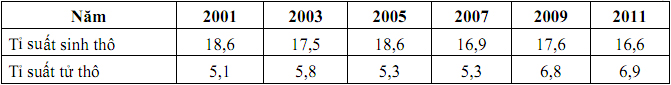 Cho bảng tỉ suất sinh thô và tỉ suất tử thô nước ta thời kỳ 2001 -2011 sau: (Đơn vị tính ‰)