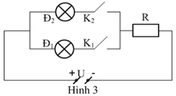 Hai bóng đèn có công suất định mức bằng nhau, mắc với một điện trở R = 5Ω và các khóa K có điện trở không đáng kể vào hiệu điện thế U không đổi như sơ đồ hình 3:
