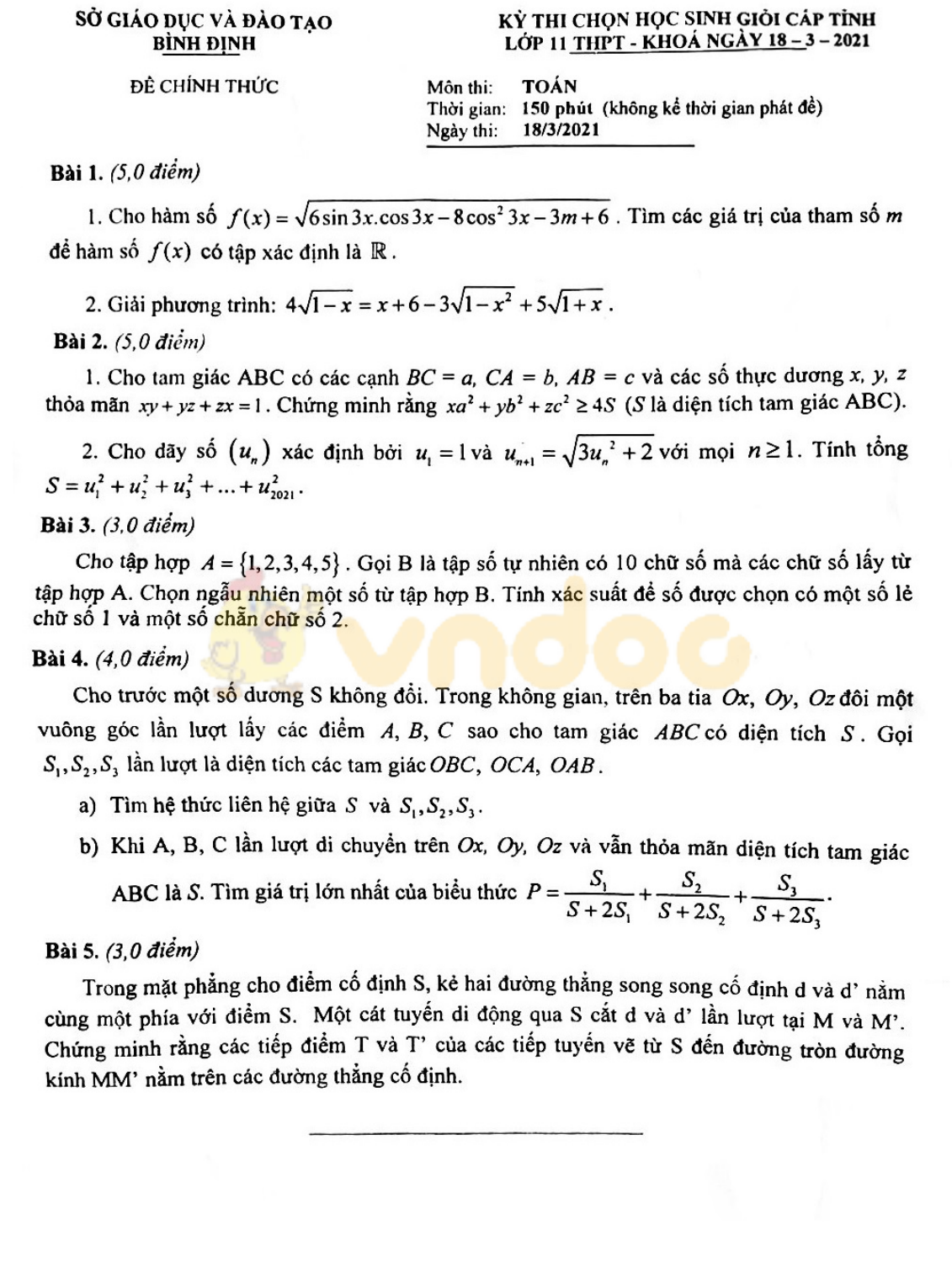VnDoc.com xin gửi tới bạn đọc bài viết Đề thi học sinh giỏi môn Toán lớp 11 Sở GD&ĐT Bình Định năm 2020-2021 để bạn đọc cùng tham khảo. Đề thi được tổng hợp gồm có 5 câu hỏi tự luận, thí sinh làm bài trong thời gian 150 phút. Mời các bạn cùng tham khảo chi tiết tại đây.