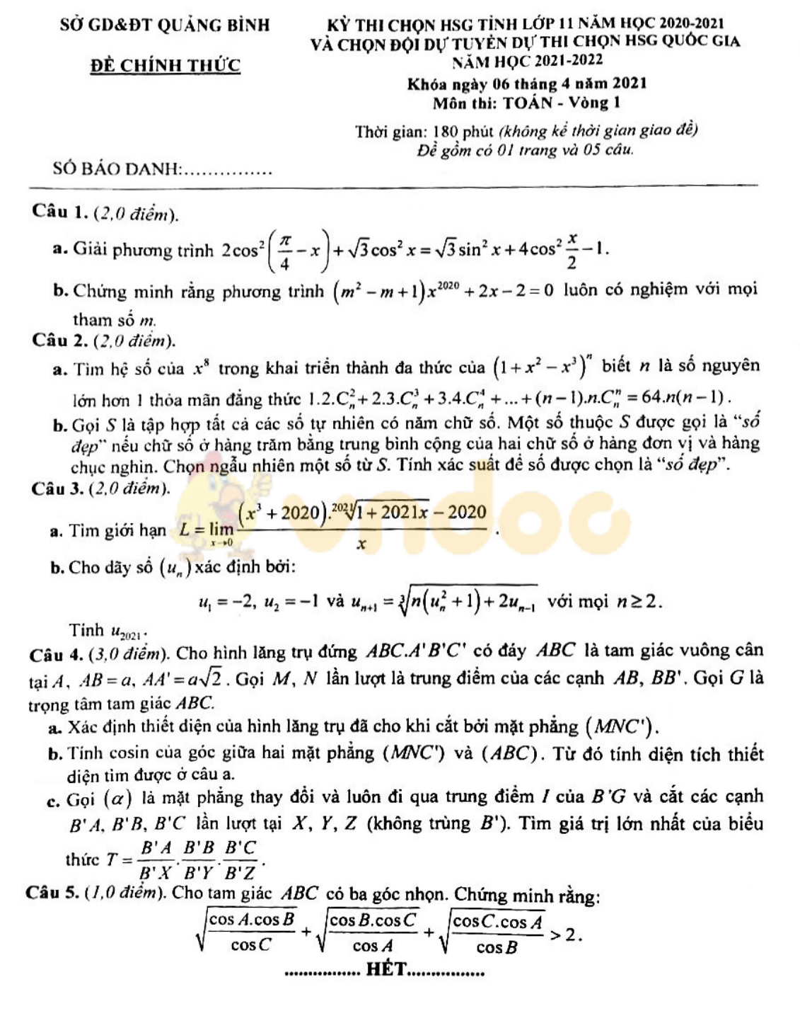 Đề thi học sinh giỏi môn Toán lớp 11 Sở GD&ĐT Quảng Bình vòng 1 năm 2020-2021