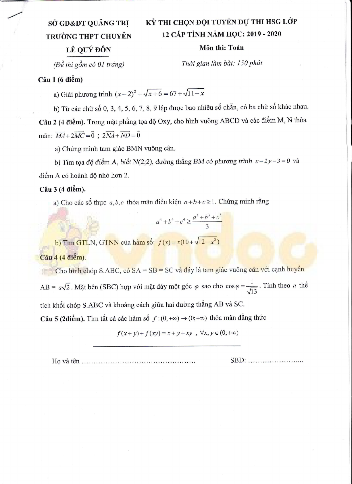 VnDoc.com xin gửi tới bạn đọc bài viết Đề thi học sinh giỏi môn Toán lớp 12 năm học 2019 - 2020 trường chuyên Lê Quý Đôn, Quảng Trị để bạn đọc cùng tham khảo và có thêm tài liệu ôn tập cho kì thi học sinh giỏi sắp tới nhé. Mời các bạn cùng tham khảo chi tiết bài viết dưới đây để hiểu rõ hơn nhé.