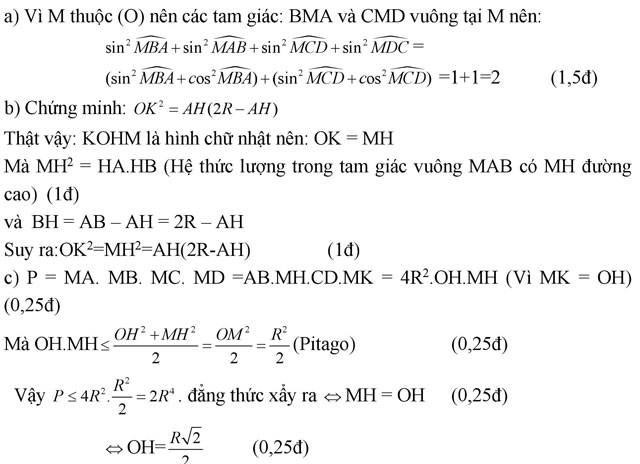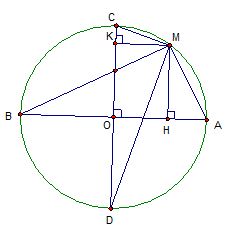 Cho đường tròn (O;). AB và CD là hai đường kính cố định của (O) vuông góc với nhau. M là một điểm thuộc cung nhỏ AC của (O). K và H lần lượt là hình chiếu của M trên CD và AB.