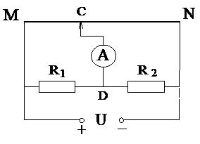 Bài 3: (4,5 điểm) Cho mạch điện có sơ đồ như hình vẽ. Hiệu điện thế hai đầu đoạn mạch được giữ không đổi là U = 7 V; các điện trở R1 = 3 Ω, R2 = 6 Ω; MN là một dây dẫn điện có chiều dài l = 1,5 m, tiết diện không đổi S = 0,1 mm2, điện trở suất ρ = 4.10-7 m. Bỏ qua điện trở của ampe kế và của các dây nối. a, Tính điện trở R của dây dẫn MN. b, Xác định vị trí điểm C để dòng điện qua ampe kế theo chiều từ D đến C và có cường độ 1/3 A. |