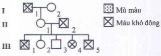 Câu 14: Bệnh mù màu đỏ - lục và bệnh máu khó đông do hai gen lặn nằm trên nhiễm sắc thể X quy định, cách nhau 12cm. Theo sơ đồ phả hệ sau, hãy cho biết:
