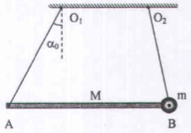 Một thanh cứng AB đồng chất, tiết diện đều, khối lượng M, chiều dài AB = L có gắn thêm một vật nhỏ khối lượng m = m/4 ở đầu mút B. Thanh được treo nằm ngang bởi hai sợi dây nhẹ, không dãn A1A và O2B (hình vẽ). Góc hợp bởi dây O1A và phương thẳng đứng là α0.