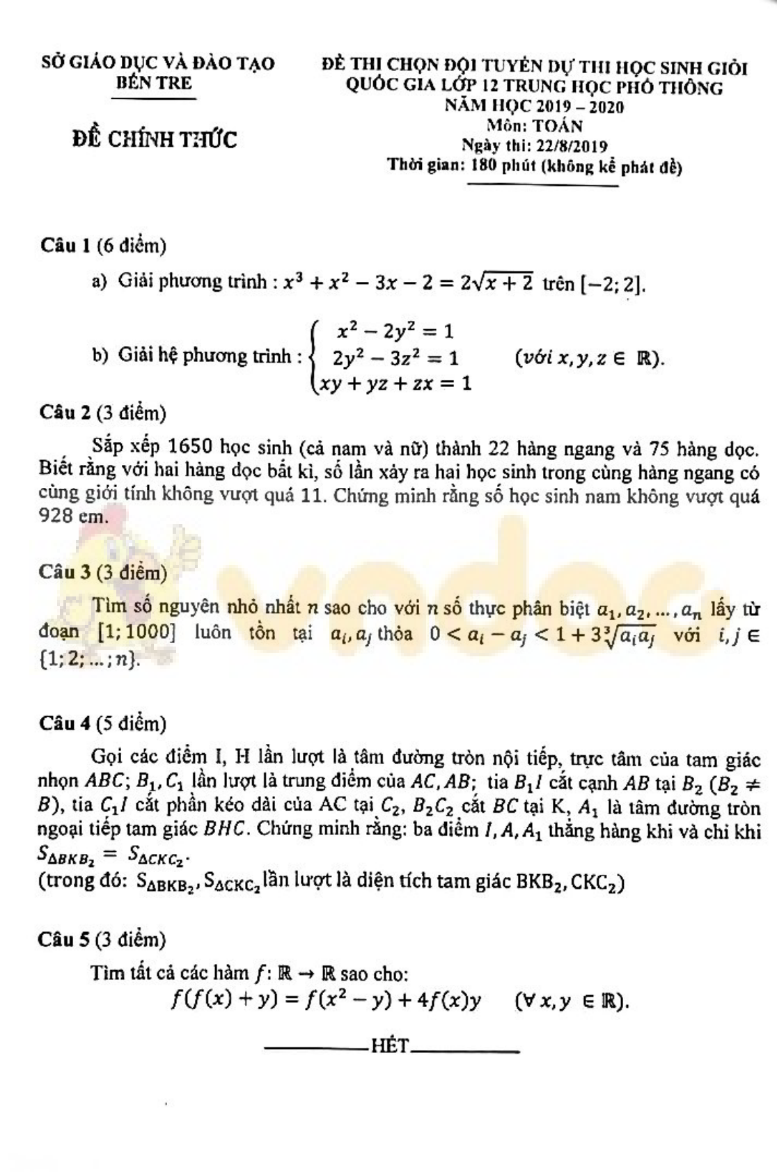 VnDoc.com xin gửi tới bạn đọc bài viết Đề thi học sinh giỏi Quốc gia môn Toán lớp 12 năm học 2019 - 2020 Sở GD&ĐT Bến Tre để bạn đọc cùng tham khảo và có thêm tài liệu ôn tập cho kì thi học sinh giỏi sắp tới nhé. Mời các bạn cùng tham khảo chi tiết bài viết dưới đây để hiểu rõ hơn nhé.