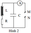Cho mạch điện như Hình 2. Cuộn dây có độ tự cảm L, tụ điện có điện dung C, điện trở có giá trị R. Biết điện áp giữa M và N là uMN = 2U0cosωt, với ω có thể thay đổi được nhưng U0 không đổi. A là ampe kế nhiệt, các phần tử trong mạch được coi là lí tưởng.