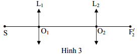 Cho một quang hệ gồm hai thấu kính mỏng L1 và L2 giống nhau có cùng tiêu cự f đặt đồng trục. Trên Hình 3, O1 và O2 là quang tâm của hai thấu kính, F/2 là tiêu điểm ảnh của thấu kính L2. Một điểm sáng S đặt tại tiêu điểm của thấu kính L1.
