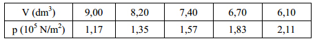 Một hỗn hợp gồm hai khí acgon (Ar) và hiđrô (H2) có khối lượng 8,5 gam, được chứa trong thể tích V0 =10 dm3 ở áp suất p0 = 105 N/m2. Khi nén đoạn nhiệt khối khí trên ta được các cặp giá trị thể tích V và áp suất p tương ứng theo bảng số liệu sau: