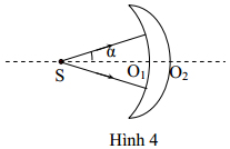 Cho một thấu kính hội tụ lõm - lồi, bằng thuỷ tinh, chiết suất n = 1,5 như Hình 4. Mặt lõm có bán kính R1 = 5,5 cm và có đỉnh tại O1. Mặt lồi có bán kính R2 và đỉnh tại O2. Khoảng cách O1O2 = 0,5 cm. Một điểm sáng S được đặt tại đúng tâm của mặt lõm và chiếu một chùm tia có góc mở rộng vào mặt thấu kính.
