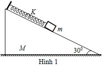 2. Một lò xo nhẹ có độ cứng K, đầu trên được gắn vào giá cố định trên mặt nêm nghiêng một góc α so với phương ngang, đầu dưới gắn vào vật nhỏ có khối lượng m (hình vẽ 1). Bỏ qua ma sát ở mặt nêm và ma sát giữa nêm với sàn ngang. Nêm có khối lượng M. Ban đầu nêm được giữ chặt, kéo m lệch khỏi vị trí cân bằng một đoạn nhỏ rồi thả nhẹ vật và đồng thời buông nêm. Tính chu kì dao động của vật m so với nêm.