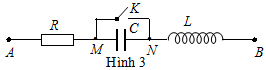 Cho mạch điện như hình vẽ 3 gồm điện trở R, tụ điện C và cuộn cảm có điện trở thuần mắc nối tiếp. Đặt vào hai đầu đoạn mạch một điện áp xoay chiều uAB = 120cos(100πt). Bỏ qua điện trở của dây nối và của khoá K.