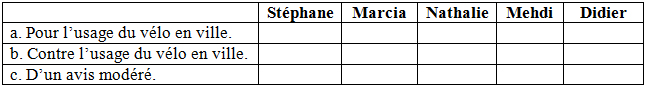 Avant de développer une nouvelle politique de transports urbains, la ville de Marseille a voulu connaître l’avis de ses citoyens sur l’usage du vélo en ville. Lisez les opinions suivantes, publiées dans le journal de la ville, puis répondez aux questions.