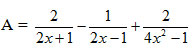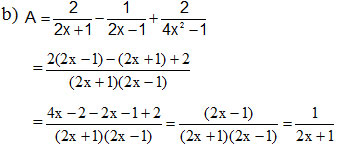 Để A = 2 ↔ 1/(2x + 1) = 2 ↔ 2(2x + 1) = 1 ↔ 4x + 2 = 1 ↔ 4x = -1 ↔ x = -1/4 (TMĐK)