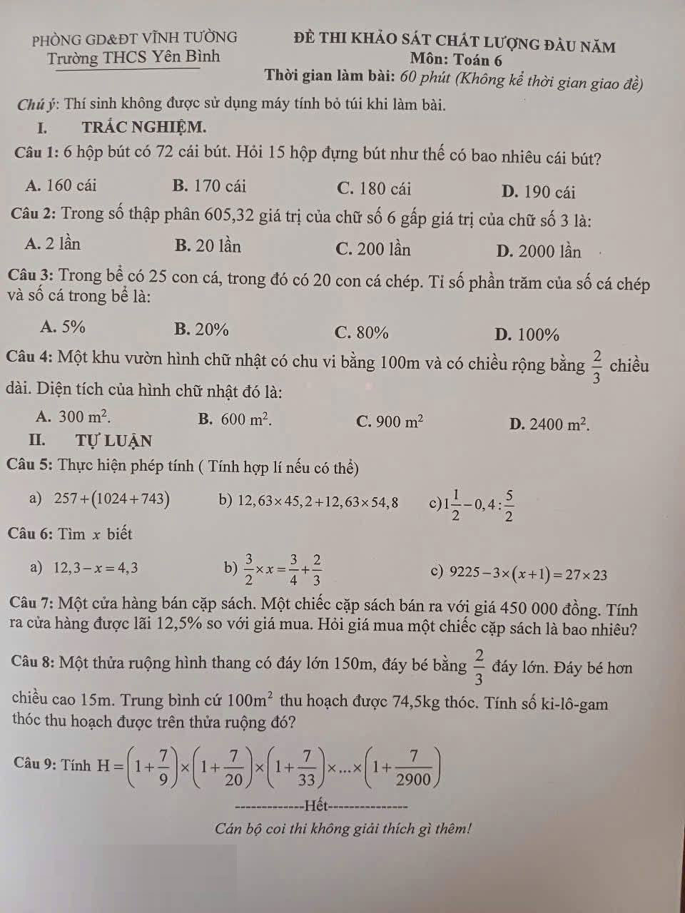 Đề thi khảo sát chất lượng đầu năm môn Toán 6 trường THCS Yên Bình, Vĩnh Tường 2025 -2026