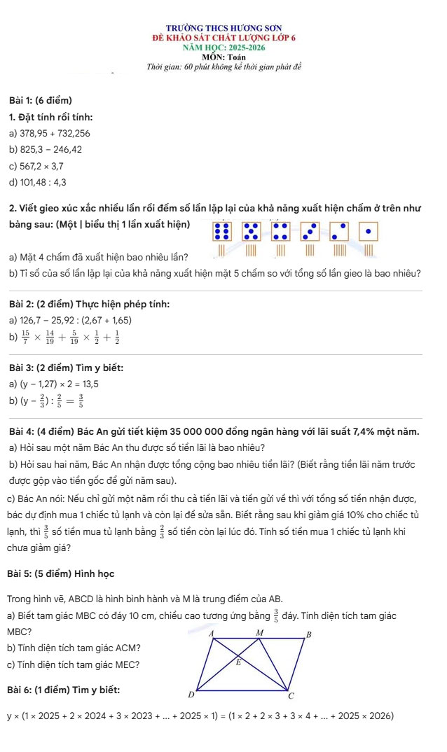 Đề thi Khảo sát chất lượng đầu năm Toán 6 trường THCS Hương Sơn 2025 -2026 là tài liệu hữu ích cho giáo viên, học sinh và phụ huynh trong quá trình ôn luyện và đánh giá năng lực học tập chuẩn bị cho kì thi khảo sát chất lượng lớp 6. Đề thi được xây dựng bám sát chương trình hiện hành, có sự phân hóa rõ rệt, phù hợp để đánh giá năng lực học sinh theo định hướng phát triển phẩm chất và năng lực.