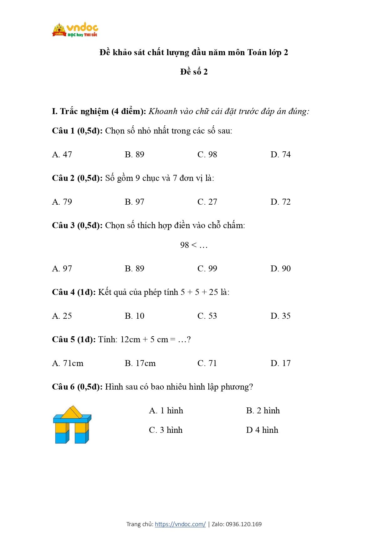Đề khảo sát chất lượng đầu năm lớp 2 môn Toán - Đề số 2 do VnDoc biên soạn là tài liệu tham khảo giúp học sinh ôn tập và đạt kết quả cao trong các bài thi khảo sát chất lượng đầu năm lớp 2.