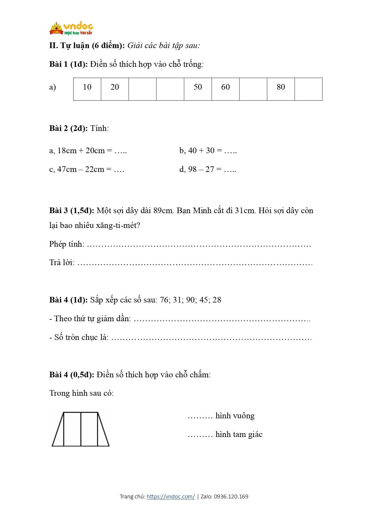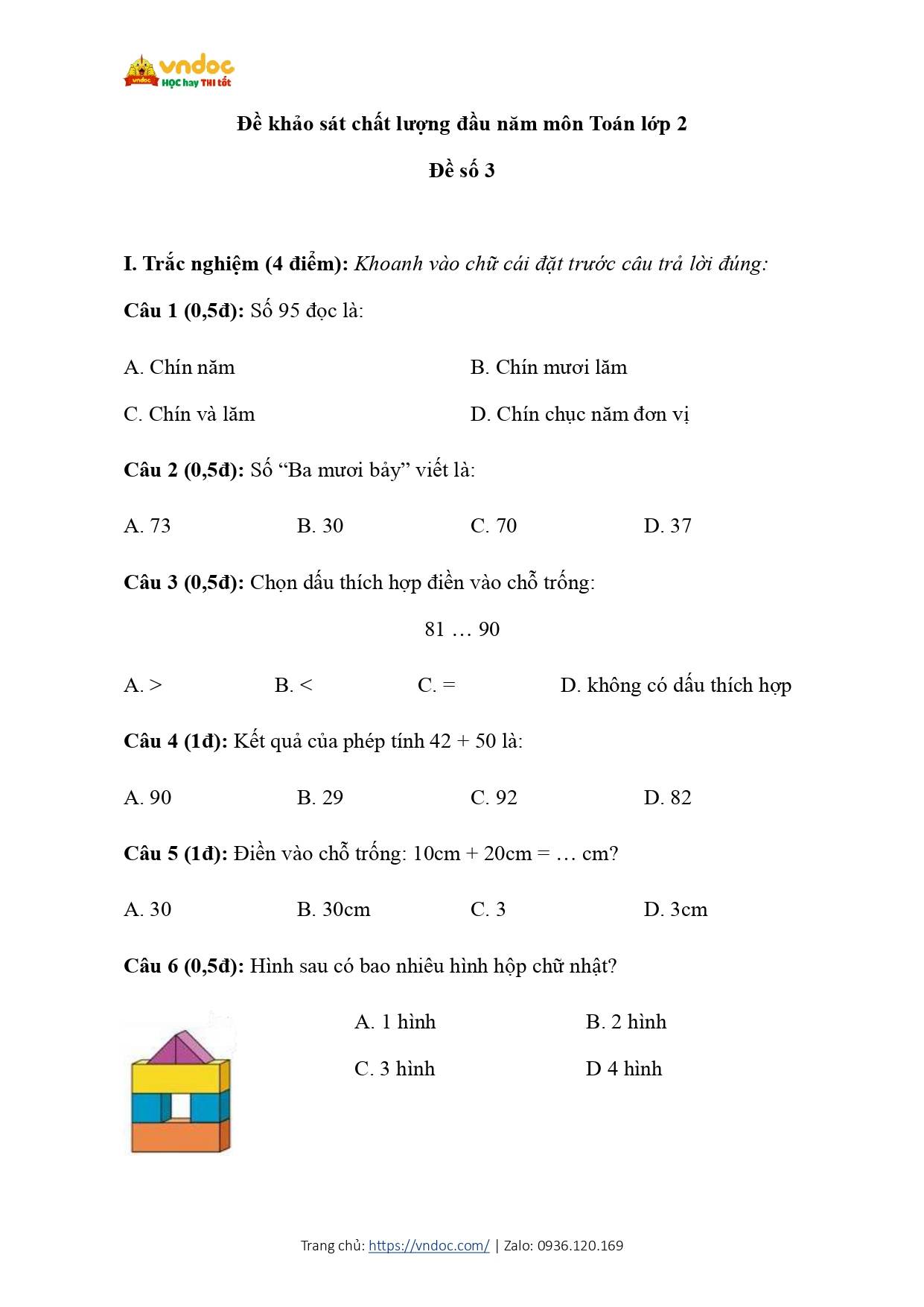 Đề khảo sát chất lượng đầu năm lớp 2 môn Toán - Đề số 3 do VnDoc biên soạn là tài liệu tham khảo giúp học sinh ôn tập và đạt kết quả cao trong các bài thi khảo sát chất lượng đầu năm lớp 2.