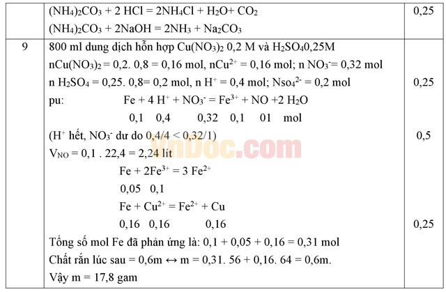 Câu 9: (1 điểm): Cho m gam bột Fe vào 800 ml dung dịch hỗn hợp Cu(NO3)2 0,2 M và H2SO4 0,25M. Sau khi các phản ứng xảy ra hoàn toàn thu được 0,6 m gam hỗn hợp bột kim loại và V lít khí NO (Sản phẩm khử duy nhất, đkc). Tìm m, V?