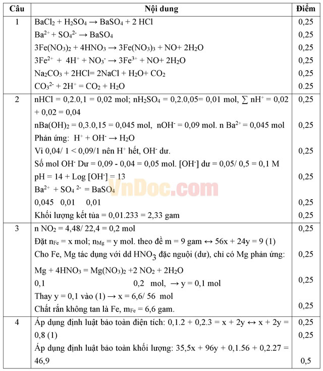 Câu 2: (1,5 điểm): Trộn 200 ml dung dịch gồm HCl 0,1M và H2SO4 0,05M với 300 ml dung dịch Ba(OH)2 nồng độ 0,15 M thu được m gam kết tủa và 500 ml dung dịch X. Giá trị của m và pH của dung dịch X.