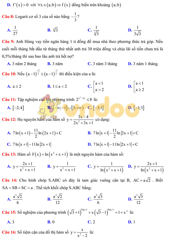 Đề thi khảo sát chất lượng THPT Quốc gia môn Toán có đáp án