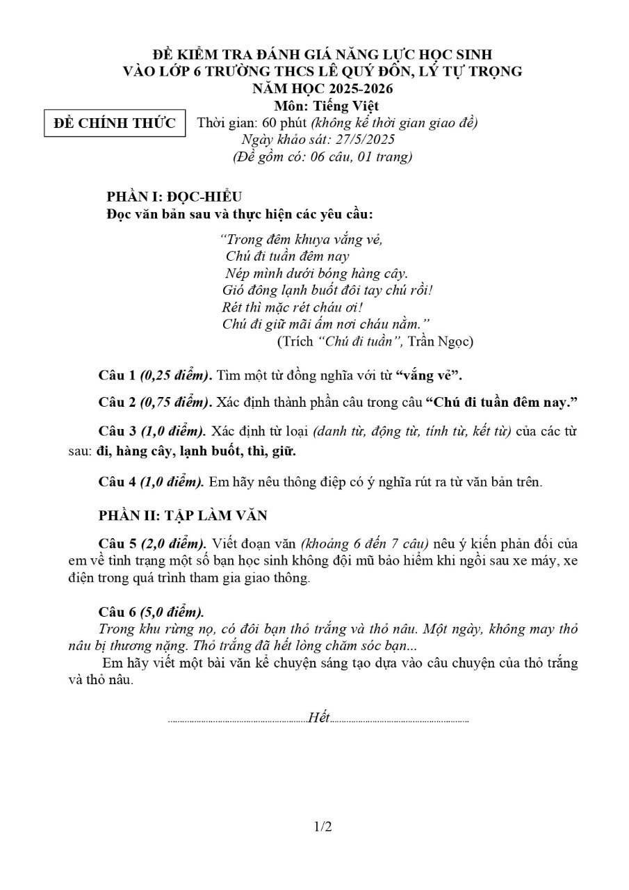 Đề thi kiểm tra đánh giá năng lực Tiếng Việt 6 trường THCS Lê Quý Đôn, Lý Tự Trọng 2025 -2026