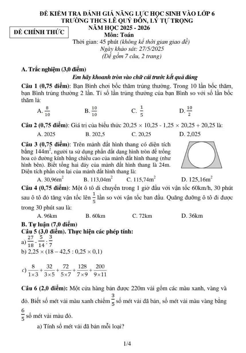 Đề thi kiểm tra đánh giá năng lực Toán 6 trường THCS Lê Quý Đôn, Lý Tự Trọng 2025 -2026