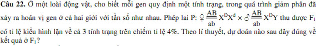 Câu 21. Lai hai cá thể đều dị hợp tử về 2 cặp gen (Aa và Bb). Trong tổng số các cá thể thu được ở đời con, số cá thể có kiểu gen đồng hợp tử lặn về cả 2 cặp gen trên chiếm tỉ lệ 4%. Biết hai cặp gen này cùng nằm trên một cặp nhiễm sắc thể thường và không xảy ra đột biến. Dự đoán nào không thể xảy ra trong quá trình phát sinh giao tử ?