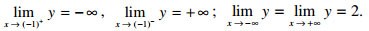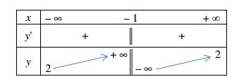 Suy ra, đồ thị hàm số có một tiệm cận đứng là đường thẳng x = −1 và một tiệm cận ngang là đường thẳng y = 2.