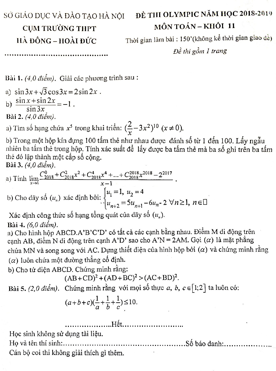 Đề thi Olympic lớp 11 môn Toán năm 2018 - 2019 cụm trường THPT Hoài Đức - Hà Nội