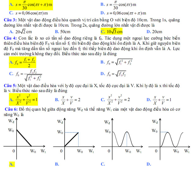 Câu 2: Treo con lắc đơn tại vị trí có gia tốc trọng trường g = 10 = π2 (m/s2), chiều dài dây treo là 1m. Bỏ qua lực cản. Kéo vật lệch khỏi phương thẳng đứng một góc 60 rồi buông nhẹ cho vật dao động. Chọn gốc thời gian khi buông vật, chiều dương là chiều chuyển động của vật ngay khi buông vật. Phương trình dao động của vật nhỏ là