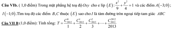 Câu VIIa. (1,0 điểm) Tính tổng: S = 12C12012 + 22C22012 + 32C32012 + .... + 20122C20122012
