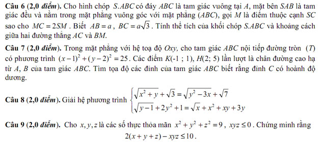 Đề thi thử đại học môn toán năm 2015 THPT Đông Sơn 1 với thang điểm 20