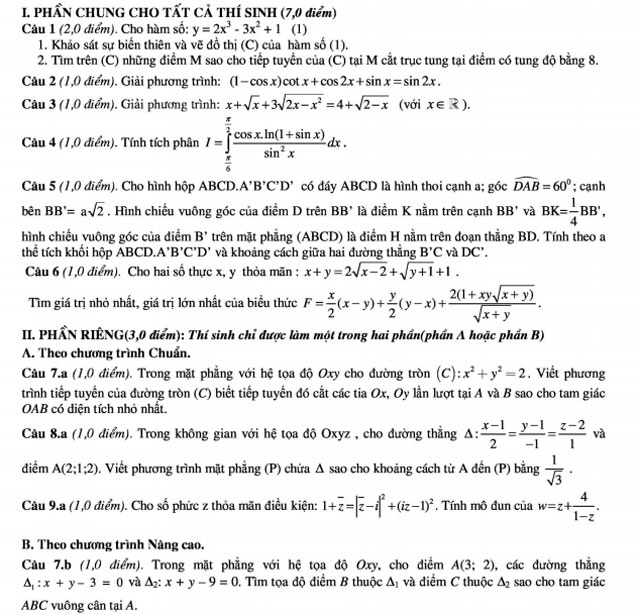 Đề thi thử Đại học môn Toán trường THPT Lương Ngọc Quyến năm 2014