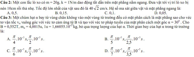 Cho biết: hằng số Plăng h = 6,625.10-34 Js; độ lớn điện tích nguyên tố e = 1,6.10-19 C; tốc độ ánh sáng trong chân không c = 3.108 m/s; số Avôgadrô NA = 6,02.1023 mol-1; gia tốc trọng trường g = 10m/s2 ;1u = 931,5 MeV/c2.
