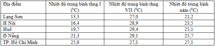 Nhiệt độ trung bình của một số địa điểm ở nước ta