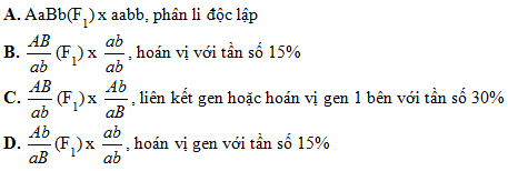 Câu 8: Ở một loài thực vật, gen A quy định thân cao trội hoàn toàn so với alen a quy định thân thấp, gen B quy định hoa đỏ trội hoàn toàn so với alen a quy định hoa trắng. Lai cây thân cao, hoa đỏ với cây thân thấp, hoa trắng thu được F1 phân li theo tỉ lệ 37,5% cây thân cao, hoa trắng: 37,5% cây thân thấp, hoa đỏ: 12,5% cây thân cao, hoa đỏ: 12,5% cây thân thấp, hoa trắng. Cho biết không có đột bíên xảy ra. Kiểu gen của cây bố, mẹ trong phép lai trên là