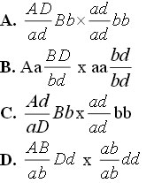 Câu 20: Ở một loài thực vật, gen A quy định thân cao, alen a quy định thân thấp; gen B quy định quả màu đỏ, gen b quy định quả màu vàng; gen D quy định quả tròn, alen d quy định quả dài. Biết rằng các gen trội là trội hoàn toàn. Cho giao phấn cây thân cao, quả đỏ, tròn với cây thân thấp, quả vàng, dài thu được F1 gồm 1602 cây thân cao, quả màu đỏ, dài : 1601 cây thân cao, quả màu vàng, dài : 1600 cây thân thấp, quả màu đỏ, tròn : 1599 cây thân thấp, quả màu vàng, tròn. Trong trường hợp không xảy ra hoán vị gen , sơ đồ lai nào dưới đây cho kết quả phù hợp với phép lai trên?