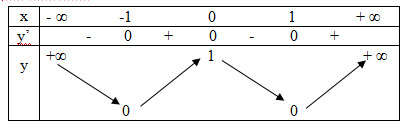 Dấu của y’: y' > 0 ↔ x ϵ (-1; 0) ᴗ (1; +∞); y' < 0 ↔ x ϵ (-∞; -1) ᴗ (0; 1)