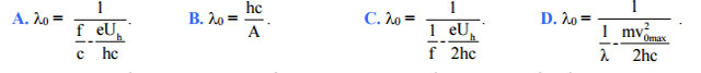 Câu 42: Về giới hạn quang điện λ0 của kim loại dùng làm catôt tế bào quang điện (Uh là độ lớn hiệu điện thế hãm, f và λ là tần số và bước sóng của ánh sáng kích thích, A là công thoát, v0max là vận tốc ban đầu cực đại của quang êlectron). Biểu thức sau không đúng là