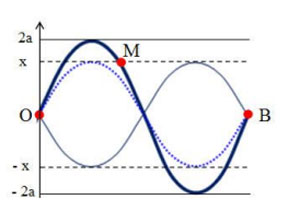 Câu 29: Sóng dừng trên sợi dây đàn hồi OB chiều dài L mô tả như hình bên. Điểm O trùng với gốc tọa độ của trục tung. Sóng tới điểm B có biên độ a. Thời điểm ban đầu hình ảnh sóng là đường nét liền đậm, sau thời gian Δt và 5Δt thì hình ảnh sóng lần lượt là đường nét đứt và đường nét liền mờ. Tốc độ truyền sóng là v. Tốc độ dao động cực đại của điểm M là