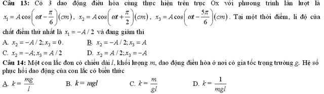 Câu 3: Một chất điểm thực hiện đồng thời hai dao động điều hòa có phương trình x1 = 6cos(30t - π/ 3) (cm) và x2 = 6cos(30t 2 - π/ 3) (cm). Dao động tổng hợp có phương trình là