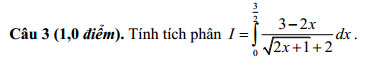 Câu 2 (1,0điểm). Giải phương trình: 2sin2x - 2cos²x + 5cosx + 2sinx + 3 = 0.