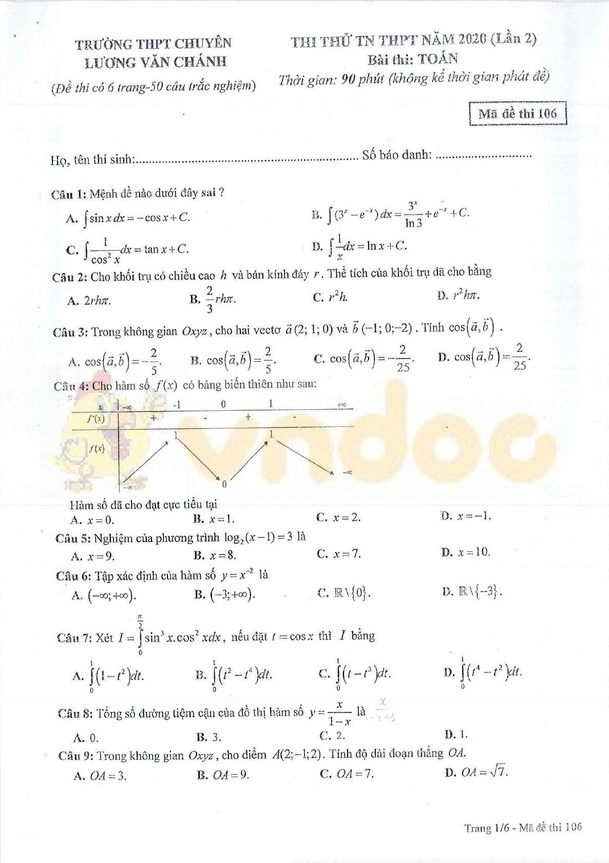 VnDoc.com xin gửi tới bạn đọc bài viết Đề thi thử THPT quốc gia 2020 môn Toán trường THPT Chuyên Lương Văn Chánh, Phú Yên lần 2 để bạn đọc cùng tham khảo. Đề thi gồm có 50 câu hỏi trắc nghiệm khách quan, thí sinh làm bài trong thời gian 90 phút. Mời các bạn cùng tham khảo.