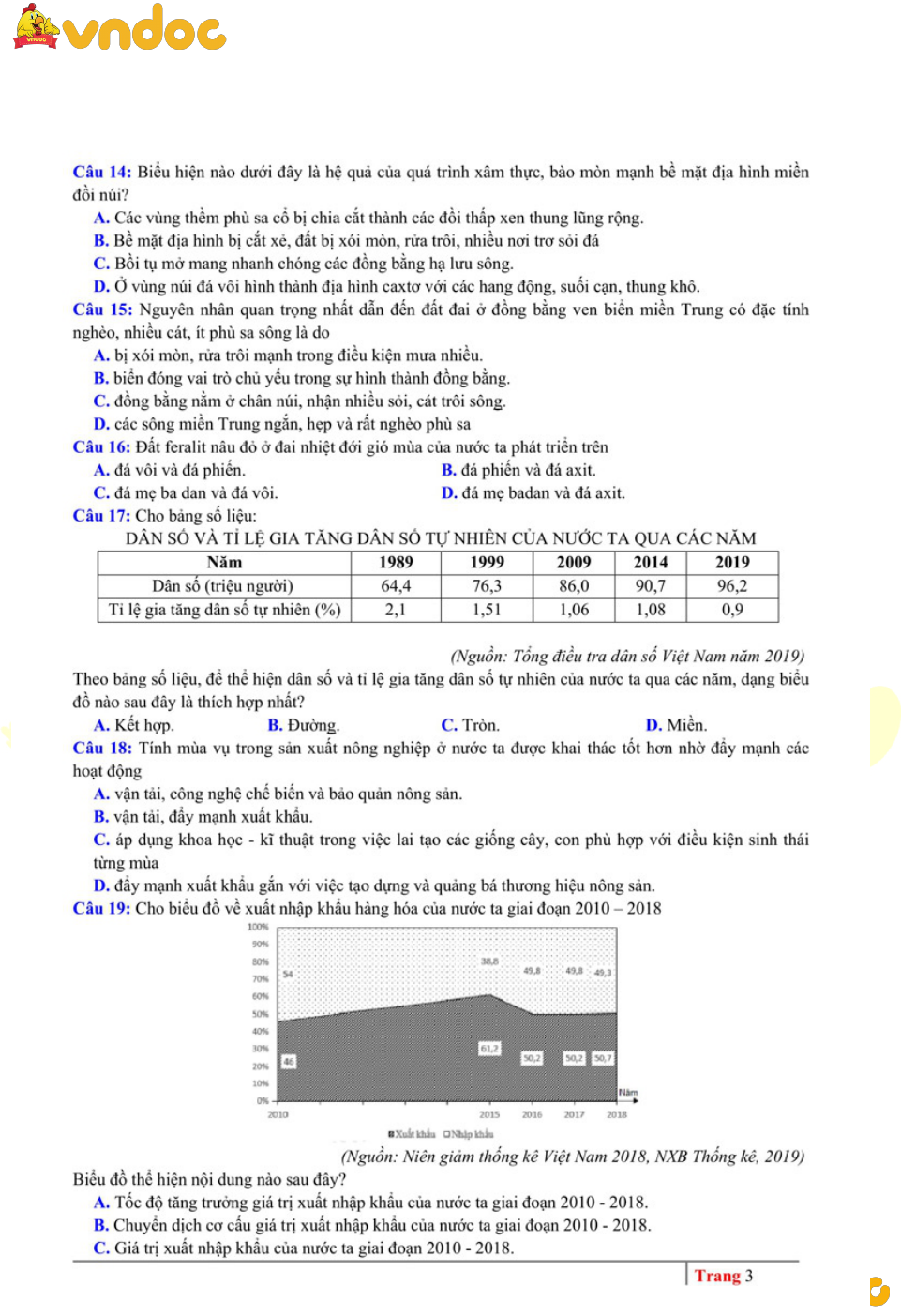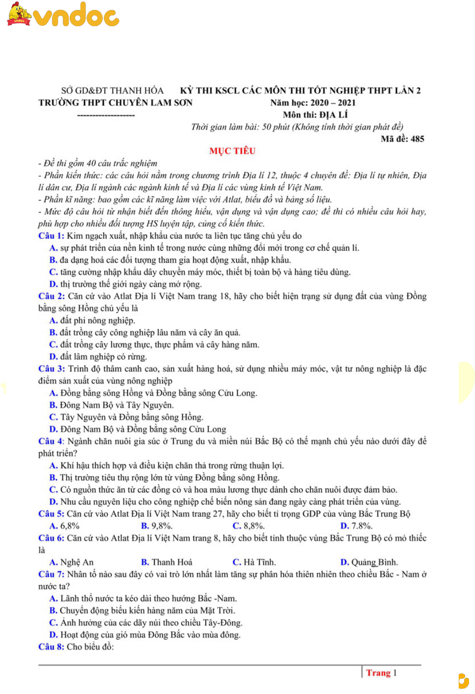 Đề thi thử THPT 2021 môn Địa lí trường THPT chuyên Lam Sơn, Thanh Hóa lần 2 được VnDoc.com sưu tầm và gửi tới bạn đọc cùng tham khảo. Đề thi với cấu trúc 40 câu hỏi trắc nghiệm có đáp án và lời giải chi tiết, được biên soạn sát với đề minh họa 2021 môn Địa, là tài liệu tham khảo hữu ích cho các em ôn thi THPT Quốc gia.