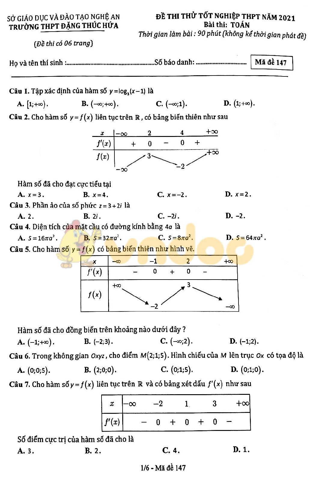 Đề thi thử THPT Quốc gia 2021 môn Toán trường THPT Đặng Thúc Hứa, Nghệ An được VnDoc.com sưu tầm và gửi tới bạn đọc cùng tham khảo. Đề thi với cấu trúc 50 câu hỏi trắc nghiệm Toán THPT, là tài liệu tham khảo hữu ích cho các em ôn thi THPT Quốc gia, chuẩn bị kĩ lưỡng cho kì thi sắp tới của mình.