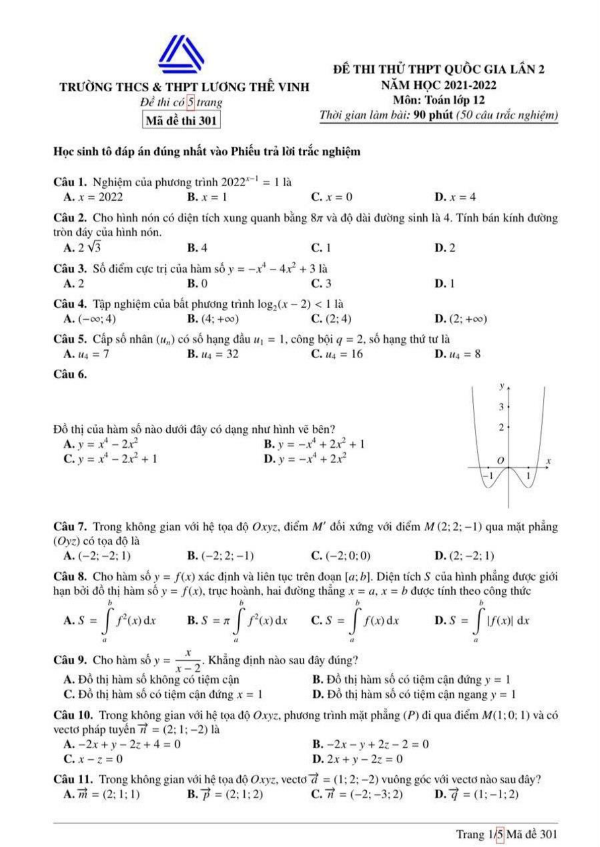 Đề thi thử THPT Quốc gia 2022 môn Toán lần 2 trường THPT Lương Thế Vinh, Hà Nội vừa được VnDoc.com sưu tầm và xin gửi tới bạn đọc cùng tham khảo. Hi vọng qua bài viết bạn đọc có thêm nhiều tài liệu để ôn tập cho kì thi THPT Quốc gia sắp tới nhé. Mời các bạn cùng tham khảo chi tiết và tải về bài viết dưới đây nhé.