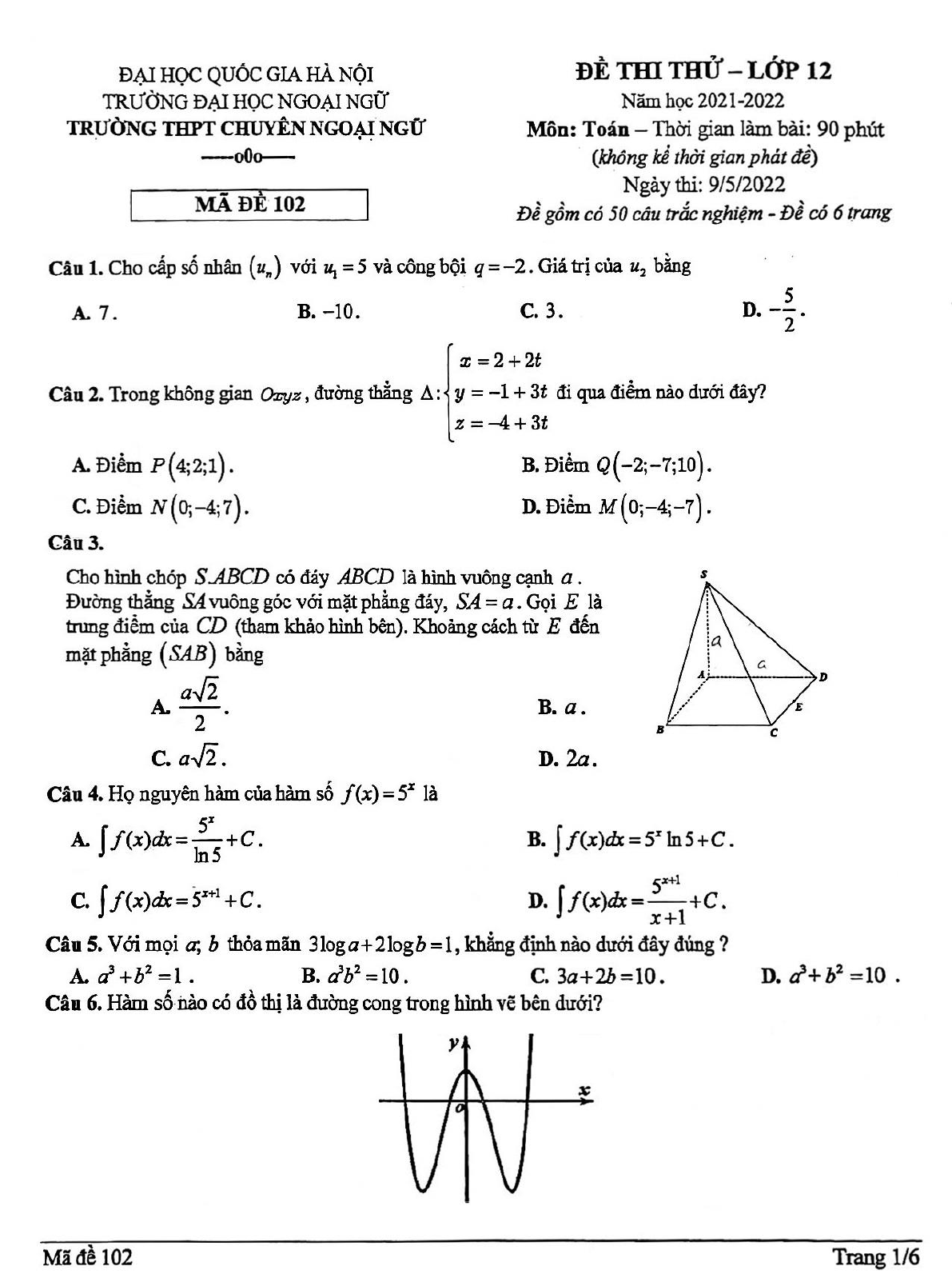 Đề thi thử THPT Quốc gia 2022 môn Toán trường THPT Chuyên Ngoại ngữ, Hà Nội